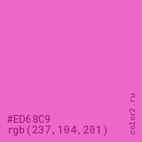 Цвет #ED68C9 в цветовой модели RGB обозначается тремя октетами (237, 104, 201) в десятичном формате и #ED68C9 в шестнадцатиричном (hex) формате, которые являются интенсивностью красного 237 (hex ED), интенсивность зелёного 104 (hex 68) и интенсивность синего 201 (hex C9).