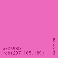 Цвет #ED69BD в цветовой модели RGB обозначается тремя октетами (237, 105, 189) в десятичном формате и #ED69BD в шестнадцатиричном (hex) формате, которые являются интенсивностью красного 237 (hex ED), интенсивность зелёного 105 (hex 69) и интенсивность синего 189 (hex BD).