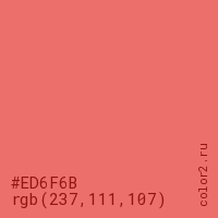 Цвет #ED6F6B в цветовой модели RGB обозначается тремя октетами (237, 111, 107) в десятичном формате и #ED6F6B в шестнадцатиричном (hex) формате, которые являются интенсивностью красного 237 (hex ED), интенсивность зелёного 111 (hex 6F) и интенсивность синего 107 (hex 6B).