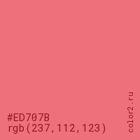Цвет #ED707B в цветовой модели RGB обозначается тремя октетами (237, 112, 123) в десятичном формате и #ED707B в шестнадцатиричном (hex) формате, которые являются интенсивностью красного 237 (hex ED), интенсивность зелёного 112 (hex 70) и интенсивность синего 123 (hex 7B).