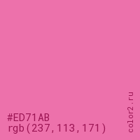 Цвет #ED71AB в цветовой модели RGB обозначается тремя октетами (237, 113, 171) в десятичном формате и #ED71AB в шестнадцатиричном (hex) формате, которые являются интенсивностью красного 237 (hex ED), интенсивность зелёного 113 (hex 71) и интенсивность синего 171 (hex AB).