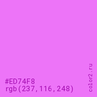 Цвет #ED74F8 в цветовой модели RGB обозначается тремя октетами (237, 116, 248) в десятичном формате и #ED74F8 в шестнадцатиричном (hex) формате, которые являются интенсивностью красного 237 (hex ED), интенсивность зелёного 116 (hex 74) и интенсивность синего 248 (hex F8).