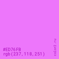 Цвет #ED76FB в цветовой модели RGB обозначается тремя октетами (237, 118, 251) в десятичном формате и #ED76FB в шестнадцатиричном (hex) формате, которые являются интенсивностью красного 237 (hex ED), интенсивность зелёного 118 (hex 76) и интенсивность синего 251 (hex FB).