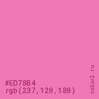 Цвет #ED78B4 в цветовой модели RGB обозначается тремя октетами (237, 120, 180) в десятичном формате и #ED78B4 в шестнадцатиричном (hex) формате, которые являются интенсивностью красного 237 (hex ED), интенсивность зелёного 120 (hex 78) и интенсивность синего 180 (hex B4).