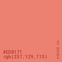 Цвет #ED8171 в цветовой модели RGB обозначается тремя октетами (237, 129, 113) в десятичном формате и #ED8171 в шестнадцатиричном (hex) формате, которые являются интенсивностью красного 237 (hex ED), интенсивность зелёного 129 (hex 81) и интенсивность синего 113 (hex 71).