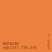 Цвет #ED8240 в цветовой модели RGB обозначается тремя октетами (237, 130, 64) в десятичном формате и #ED8240 в шестнадцатиричном (hex) формате, которые являются интенсивностью красного 237 (hex ED), интенсивность зелёного 130 (hex 82) и интенсивность синего 64 (hex 40).