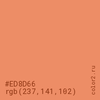 Цвет #ED8D66 в цветовой модели RGB обозначается тремя октетами (237, 141, 102) в десятичном формате и #ED8D66 в шестнадцатиричном (hex) формате, которые являются интенсивностью красного 237 (hex ED), интенсивность зелёного 141 (hex 8D) и интенсивность синего 102 (hex 66).
