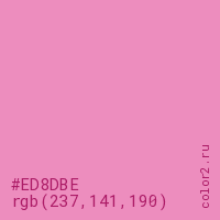 Цвет #ED8DBE в цветовой модели RGB обозначается тремя октетами (237, 141, 190) в десятичном формате и #ED8DBE в шестнадцатиричном (hex) формате, которые являются интенсивностью красного 237 (hex ED), интенсивность зелёного 141 (hex 8D) и интенсивность синего 190 (hex BE).
