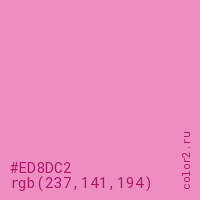 Цвет #ED8DC2 в цветовой модели RGB обозначается тремя октетами (237, 141, 194) в десятичном формате и #ED8DC2 в шестнадцатиричном (hex) формате, которые являются интенсивностью красного 237 (hex ED), интенсивность зелёного 141 (hex 8D) и интенсивность синего 194 (hex C2).