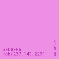 Цвет #ED8FE5 в цветовой модели RGB обозначается тремя октетами (237, 143, 229) в десятичном формате и #ED8FE5 в шестнадцатиричном (hex) формате, которые являются интенсивностью красного 237 (hex ED), интенсивность зелёного 143 (hex 8F) и интенсивность синего 229 (hex E5).