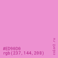 Цвет #ED90D0 в цветовой модели RGB обозначается тремя октетами (237, 144, 208) в десятичном формате и #ED90D0 в шестнадцатиричном (hex) формате, которые являются интенсивностью красного 237 (hex ED), интенсивность зелёного 144 (hex 90) и интенсивность синего 208 (hex D0).