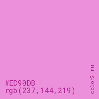 Цвет #ED90DB в цветовой модели RGB обозначается тремя октетами (237, 144, 219) в десятичном формате и #ED90DB в шестнадцатиричном (hex) формате, которые являются интенсивностью красного 237 (hex ED), интенсивность зелёного 144 (hex 90) и интенсивность синего 219 (hex DB).