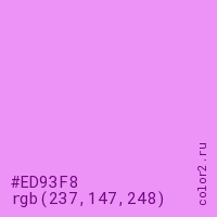 Цвет #ED93F8 в цветовой модели RGB обозначается тремя октетами (237, 147, 248) в десятичном формате и #ED93F8 в шестнадцатиричном (hex) формате, которые являются интенсивностью красного 237 (hex ED), интенсивность зелёного 147 (hex 93) и интенсивность синего 248 (hex F8).