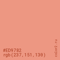 Цвет #ED9782 в цветовой модели RGB обозначается тремя октетами (237, 151, 130) в десятичном формате и #ED9782 в шестнадцатиричном (hex) формате, которые являются интенсивностью красного 237 (hex ED), интенсивность зелёного 151 (hex 97) и интенсивность синего 130 (hex 82).