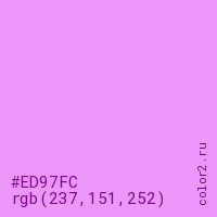 Цвет RGB(237, 151, 252) в процентом отношении количества цвета состоит из 92.9% красного (red), 59.2% зелёного (green) и 98.8% синего (blue).