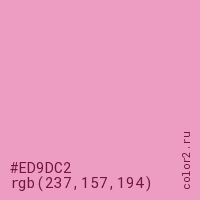 Цвет #ED9DC2 в цветовой модели RGB обозначается тремя октетами (237, 157, 194) в десятичном формате и #ED9DC2 в шестнадцатиричном (hex) формате, которые являются интенсивностью красного 237 (hex ED), интенсивность зелёного 157 (hex 9D) и интенсивность синего 194 (hex C2).
