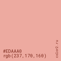 Цвет #EDAAA0 в цветовой модели RGB обозначается тремя октетами (237, 170, 160) в десятичном формате и #EDAAA0 в шестнадцатиричном (hex) формате, которые являются интенсивностью красного 237 (hex ED), интенсивность зелёного 170 (hex AA) и интенсивность синего 160 (hex A0).