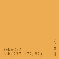 Цвет #EDAC52 в цветовой модели RGB обозначается тремя октетами (237, 172, 82) в десятичном формате и #EDAC52 в шестнадцатиричном (hex) формате, которые являются интенсивностью красного 237 (hex ED), интенсивность зелёного 172 (hex AC) и интенсивность синего 82 (hex 52).