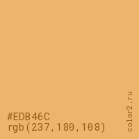 Цвет #EDB46C в цветовой модели RGB обозначается тремя октетами (237, 180, 108) в десятичном формате и #EDB46C в шестнадцатиричном (hex) формате, которые являются интенсивностью красного 237 (hex ED), интенсивность зелёного 180 (hex B4) и интенсивность синего 108 (hex 6C).
