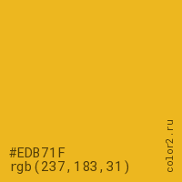 Цвет #EDB71F в цветовой модели RGB обозначается тремя октетами (237, 183, 31) в десятичном формате и #EDB71F в шестнадцатиричном (hex) формате, которые являются интенсивностью красного 237 (hex ED), интенсивность зелёного 183 (hex B7) и интенсивность синего 31 (hex 1F).