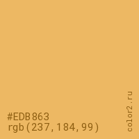 Цвет #EDB863 в цветовой модели RGB обозначается тремя октетами (237, 184, 99) в десятичном формате и #EDB863 в шестнадцатиричном (hex) формате, которые являются интенсивностью красного 237 (hex ED), интенсивность зелёного 184 (hex B8) и интенсивность синего 99 (hex 63).