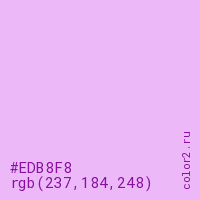 Цвет #EDB8F8 в цветовой модели RGB обозначается тремя октетами (237, 184, 248) в десятичном формате и #EDB8F8 в шестнадцатиричном (hex) формате, которые являются интенсивностью красного 237 (hex ED), интенсивность зелёного 184 (hex B8) и интенсивность синего 248 (hex F8).