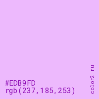 Цвет #EDB9FD в цветовой модели RGB обозначается тремя октетами (237, 185, 253) в десятичном формате и #EDB9FD в шестнадцатиричном (hex) формате, которые являются интенсивностью красного 237 (hex ED), интенсивность зелёного 185 (hex B9) и интенсивность синего 253 (hex FD).