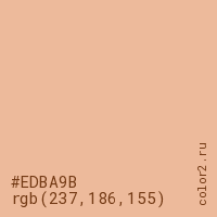 Цвет #EDBA9B в цветовой модели RGB обозначается тремя октетами (237, 186, 155) в десятичном формате и #EDBA9B в шестнадцатиричном (hex) формате, которые являются интенсивностью красного 237 (hex ED), интенсивность зелёного 186 (hex BA) и интенсивность синего 155 (hex 9B).