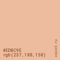Цвет #EDBC9E в цветовой модели RGB обозначается тремя октетами (237, 188, 158) в десятичном формате и #EDBC9E в шестнадцатиричном (hex) формате, которые являются интенсивностью красного 237 (hex ED), интенсивность зелёного 188 (hex BC) и интенсивность синего 158 (hex 9E).
