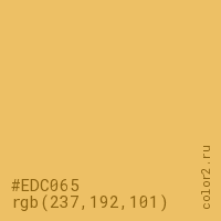 Цвет #EDC065 в цветовой модели RGB обозначается тремя октетами (237, 192, 101) в десятичном формате и #EDC065 в шестнадцатиричном (hex) формате, которые являются интенсивностью красного 237 (hex ED), интенсивность зелёного 192 (hex C0) и интенсивность синего 101 (hex 65).