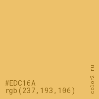Цвет #EDC16A в цветовой модели RGB обозначается тремя октетами (237, 193, 106) в десятичном формате и #EDC16A в шестнадцатиричном (hex) формате, которые являются интенсивностью красного 237 (hex ED), интенсивность зелёного 193 (hex C1) и интенсивность синего 106 (hex 6A).