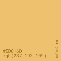Цвет #EDC16D в цветовой модели RGB обозначается тремя октетами (237, 193, 109) в десятичном формате и #EDC16D в шестнадцатиричном (hex) формате, которые являются интенсивностью красного 237 (hex ED), интенсивность зелёного 193 (hex C1) и интенсивность синего 109 (hex 6D).