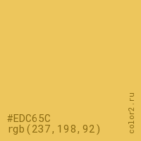 Цвет #EDC65C в цветовой модели RGB обозначается тремя октетами (237, 198, 92) в десятичном формате и #EDC65C в шестнадцатиричном (hex) формате, которые являются интенсивностью красного 237 (hex ED), интенсивность зелёного 198 (hex C6) и интенсивность синего 92 (hex 5C).