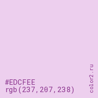 Цвет #EDCFEE в цветовой модели RGB обозначается тремя октетами (237, 207, 238) в десятичном формате и #EDCFEE в шестнадцатиричном (hex) формате, которые являются интенсивностью красного 237 (hex ED), интенсивность зелёного 207 (hex CF) и интенсивность синего 238 (hex EE).