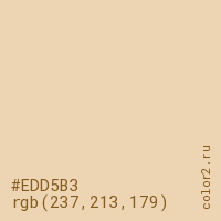 Цвет #EDD5B3 в цветовой модели RGB обозначается тремя октетами (237, 213, 179) в десятичном формате и #EDD5B3 в шестнадцатиричном (hex) формате, которые являются интенсивностью красного 237 (hex ED), интенсивность зелёного 213 (hex D5) и интенсивность синего 179 (hex B3).