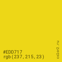 Цвет #EDD717 в цветовой модели RGB обозначается тремя октетами (237, 215, 23) в десятичном формате и #EDD717 в шестнадцатиричном (hex) формате, которые являются интенсивностью красного 237 (hex ED), интенсивность зелёного 215 (hex D7) и интенсивность синего 23 (hex 17).