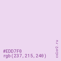 Цвет #EDD7F0 в цветовой модели RGB обозначается тремя октетами (237, 215, 240) в десятичном формате и #EDD7F0 в шестнадцатиричном (hex) формате, которые являются интенсивностью красного 237 (hex ED), интенсивность зелёного 215 (hex D7) и интенсивность синего 240 (hex F0).
