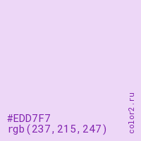 Цвет #EDD7F7 в цветовой модели RGB обозначается тремя октетами (237, 215, 247) в десятичном формате и #EDD7F7 в шестнадцатиричном (hex) формате, которые являются интенсивностью красного 237 (hex ED), интенсивность зелёного 215 (hex D7) и интенсивность синего 247 (hex F7).
