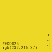 Цвет #EDD825 в цветовой модели RGB обозначается тремя октетами (237, 216, 37) в десятичном формате и #EDD825 в шестнадцатиричном (hex) формате, которые являются интенсивностью красного 237 (hex ED), интенсивность зелёного 216 (hex D8) и интенсивность синего 37 (hex 25).