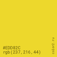 Цвет #EDD82C в цветовой модели RGB обозначается тремя октетами (237, 216, 44) в десятичном формате и #EDD82C в шестнадцатиричном (hex) формате, которые являются интенсивностью красного 237 (hex ED), интенсивность зелёного 216 (hex D8) и интенсивность синего 44 (hex 2C).