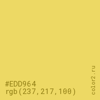 Цвет #EDD964 в цветовой модели RGB обозначается тремя октетами (237, 217, 100) в десятичном формате и #EDD964 в шестнадцатиричном (hex) формате, которые являются интенсивностью красного 237 (hex ED), интенсивность зелёного 217 (hex D9) и интенсивность синего 100 (hex 64).