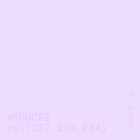 Цвет #EDDCFE в цветовой модели RGB обозначается тремя октетами (237, 220, 254) в десятичном формате и #EDDCFE в шестнадцатиричном (hex) формате, которые являются интенсивностью красного 237 (hex ED), интенсивность зелёного 220 (hex DC) и интенсивность синего 254 (hex FE).