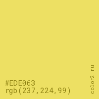 Цвет #EDE063 в цветовой модели RGB обозначается тремя октетами (237, 224, 99) в десятичном формате и #EDE063 в шестнадцатиричном (hex) формате, которые являются интенсивностью красного 237 (hex ED), интенсивность зелёного 224 (hex E0) и интенсивность синего 99 (hex 63).