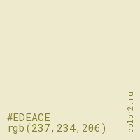 Цвет #EDEACE в цветовой модели RGB обозначается тремя октетами (237, 234, 206) в десятичном формате и #EDEACE в шестнадцатиричном (hex) формате, которые являются интенсивностью красного 237 (hex ED), интенсивность зелёного 234 (hex EA) и интенсивность синего 206 (hex CE).