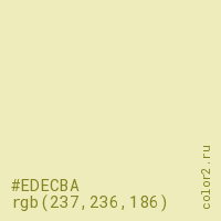 Цвет #EDECBA в цветовой модели RGB обозначается тремя октетами (237, 236, 186) в десятичном формате и #EDECBA в шестнадцатиричном (hex) формате, которые являются интенсивностью красного 237 (hex ED), интенсивность зелёного 236 (hex EC) и интенсивность синего 186 (hex BA).