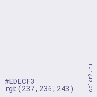 Цвет #EDECF3 в цветовой модели RGB обозначается тремя октетами (237, 236, 243) в десятичном формате и #EDECF3 в шестнадцатиричном (hex) формате, которые являются интенсивностью красного 237 (hex ED), интенсивность зелёного 236 (hex EC) и интенсивность синего 243 (hex F3).