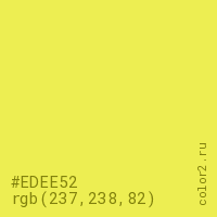 Цвет #EDEE52 в цветовой модели RGB обозначается тремя октетами (237, 238, 82) в десятичном формате и #EDEE52 в шестнадцатиричном (hex) формате, которые являются интенсивностью красного 237 (hex ED), интенсивность зелёного 238 (hex EE) и интенсивность синего 82 (hex 52).