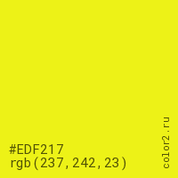 Цвет #EDF217 в цветовой модели RGB обозначается тремя октетами (237, 242, 23) в десятичном формате и #EDF217 в шестнадцатиричном (hex) формате, которые являются интенсивностью красного 237 (hex ED), интенсивность зелёного 242 (hex F2) и интенсивность синего 23 (hex 17).