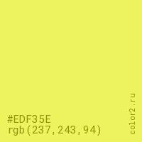 Цвет #EDF35E в цветовой модели RGB обозначается тремя октетами (237, 243, 94) в десятичном формате и #EDF35E в шестнадцатиричном (hex) формате, которые являются интенсивностью красного 237 (hex ED), интенсивность зелёного 243 (hex F3) и интенсивность синего 94 (hex 5E).