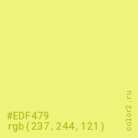Цвет #EDF479 в цветовой модели RGB обозначается тремя октетами (237, 244, 121) в десятичном формате и #EDF479 в шестнадцатиричном (hex) формате, которые являются интенсивностью красного 237 (hex ED), интенсивность зелёного 244 (hex F4) и интенсивность синего 121 (hex 79).